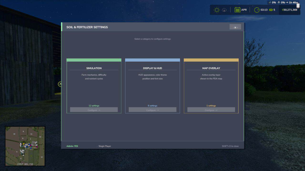 All settings are in-game under Soil & Fertilizer in the game menu. In multiplayer, gameplay settings are admin-controlled. HUD/display settings are always per-player.