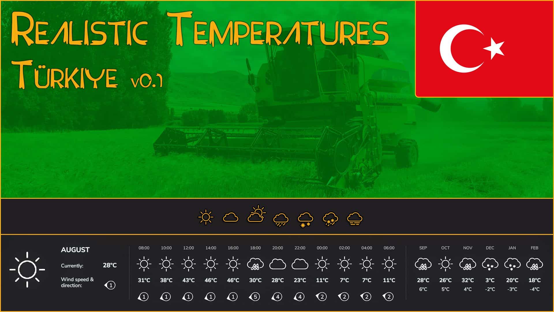 I bring you Realistic Temperatures – Türkiye, the twentieth of a series of scripts for FS25 that will allow for more realistic and varied temperatures depending on the region you are playing. This mod also allows for rain/snow/hail to happen in more seasons, region dependent.