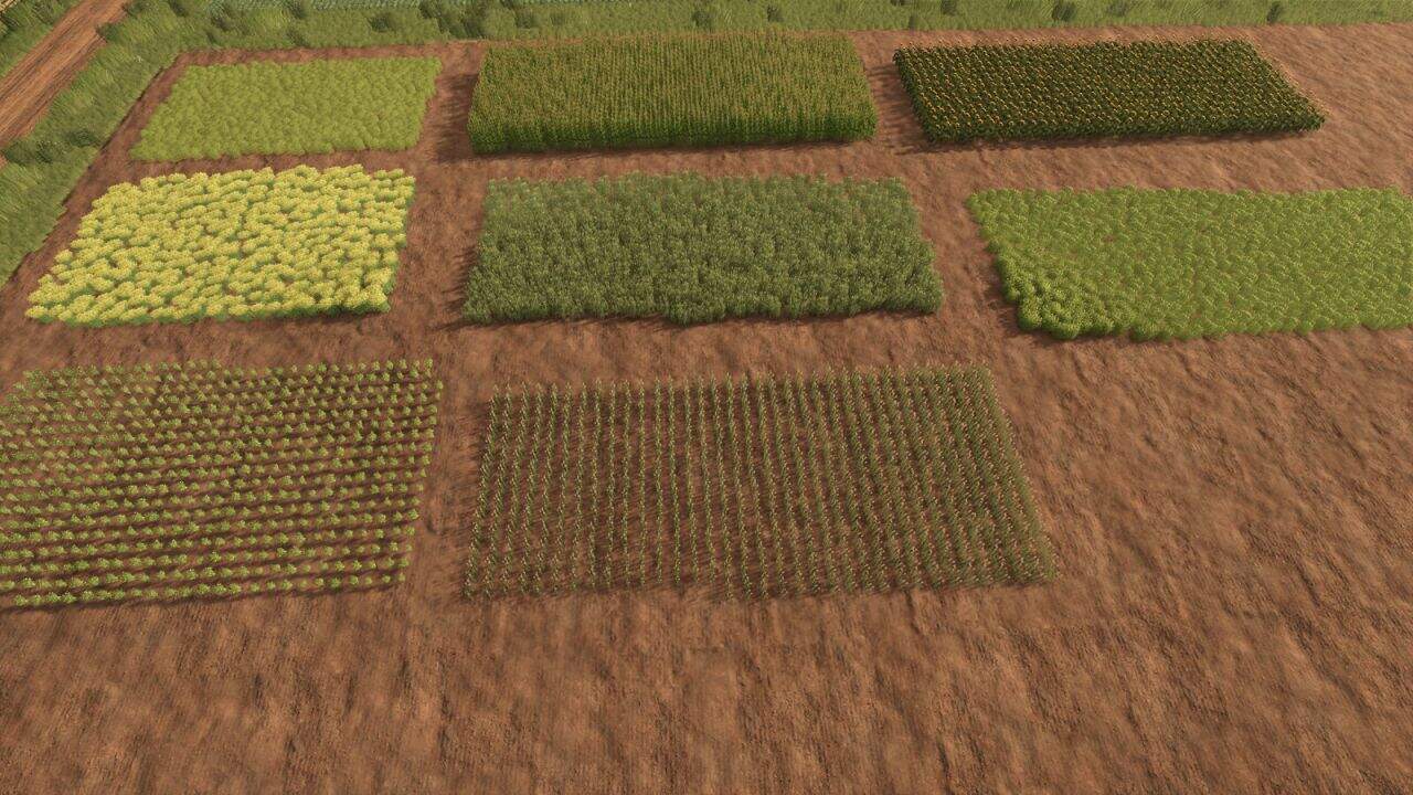 This prefab provides realistic Brazilian-style growth patterns for eight major crops: Barley, Canola, Cotton, Maize, Oat, Sorghum, Sunflower, and Wheat.