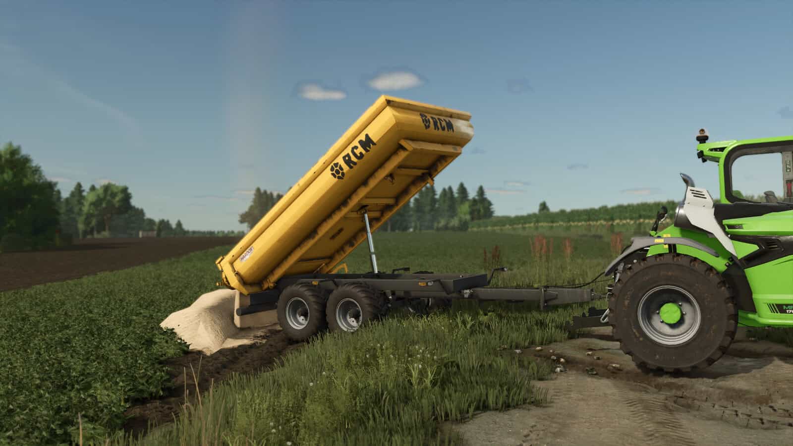 Excavator trailer of the Polish brand RCM PK1. The trailer performs the function of a dump truck. It is designed specifically for excavators, but can also be used for tranporting with an ordinary tractor. The rear hatch opens in two ways – as a classic tipper, or as a hatch-door, which allows even more convenient unloading, loading, as well as transporting long elements.