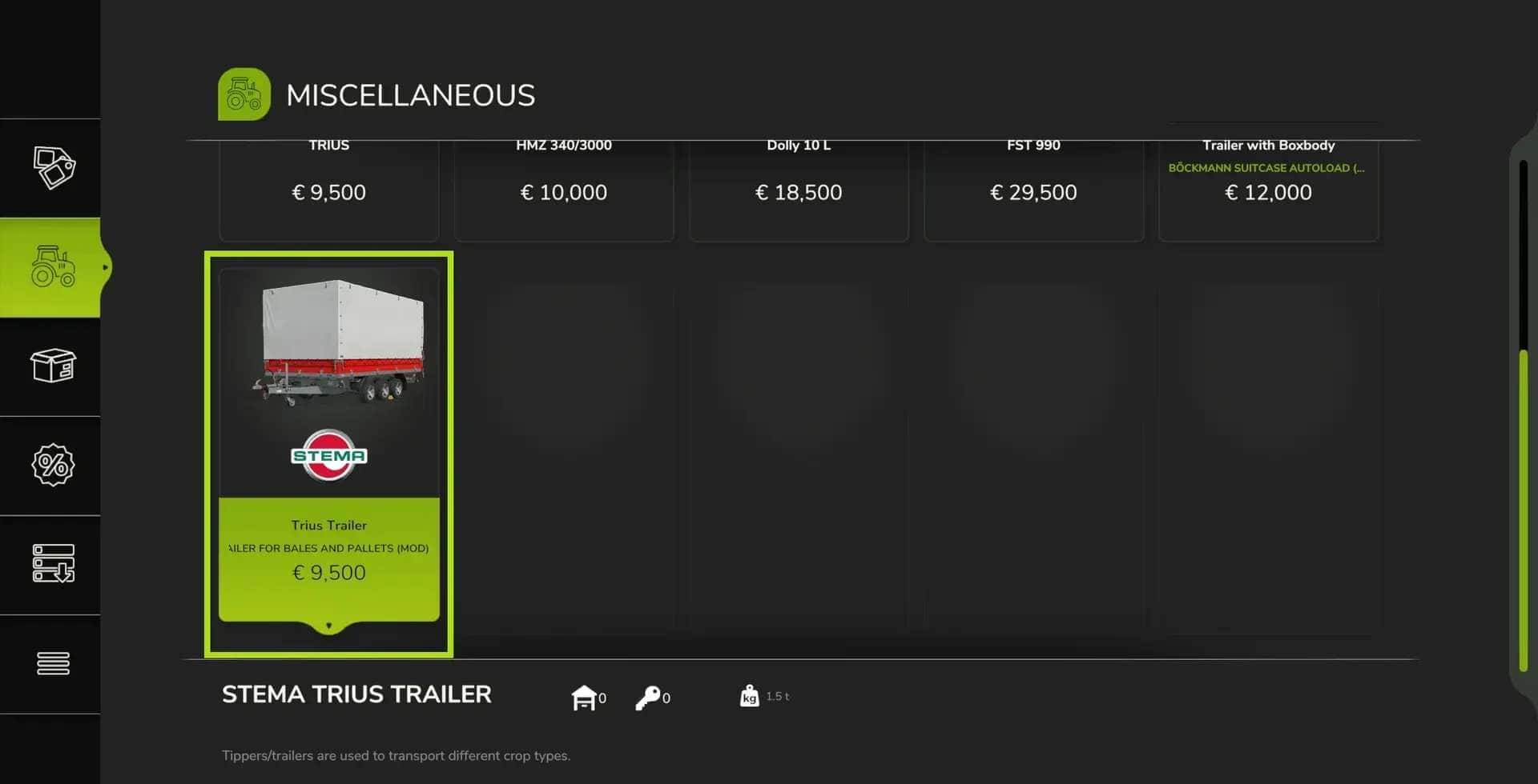 This version of the Stema Trius can accommodate bales and pallets as cargo. It has the same configurations as the base game version. Loading bulk goods is no longer possible.