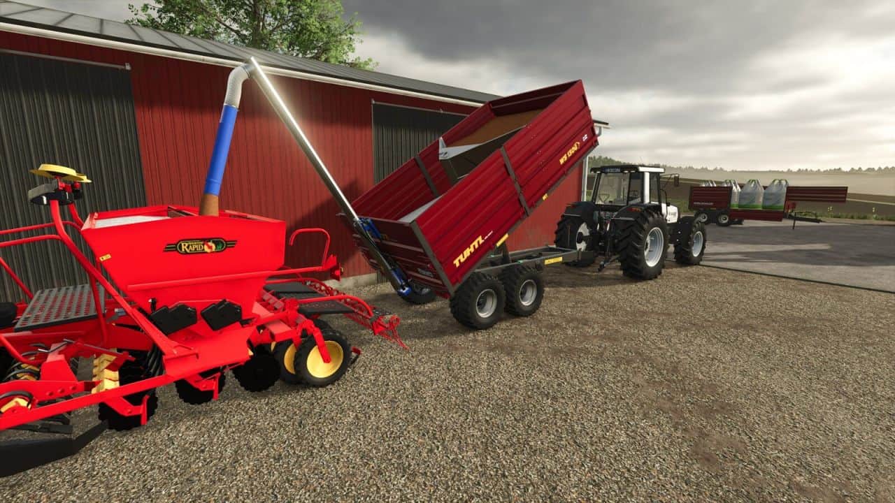This mod offers three capacities from 5.6 m³ to 18.4 m³. On some configurations sides can be opened for bale and pallet loading. You can also choose not to have sides at all, or a handy frame for easy and safe transport for 125 cm round bales. In addition, you can equip the tipper with a filling auger from Jussi-Tuote to make filling the seeder easier and faster. Both seeds and fertilizer can be filled from the same trailer thanks to the partition wall included in the auger package. Other optional accessories include different cover options and a trailer hitch.