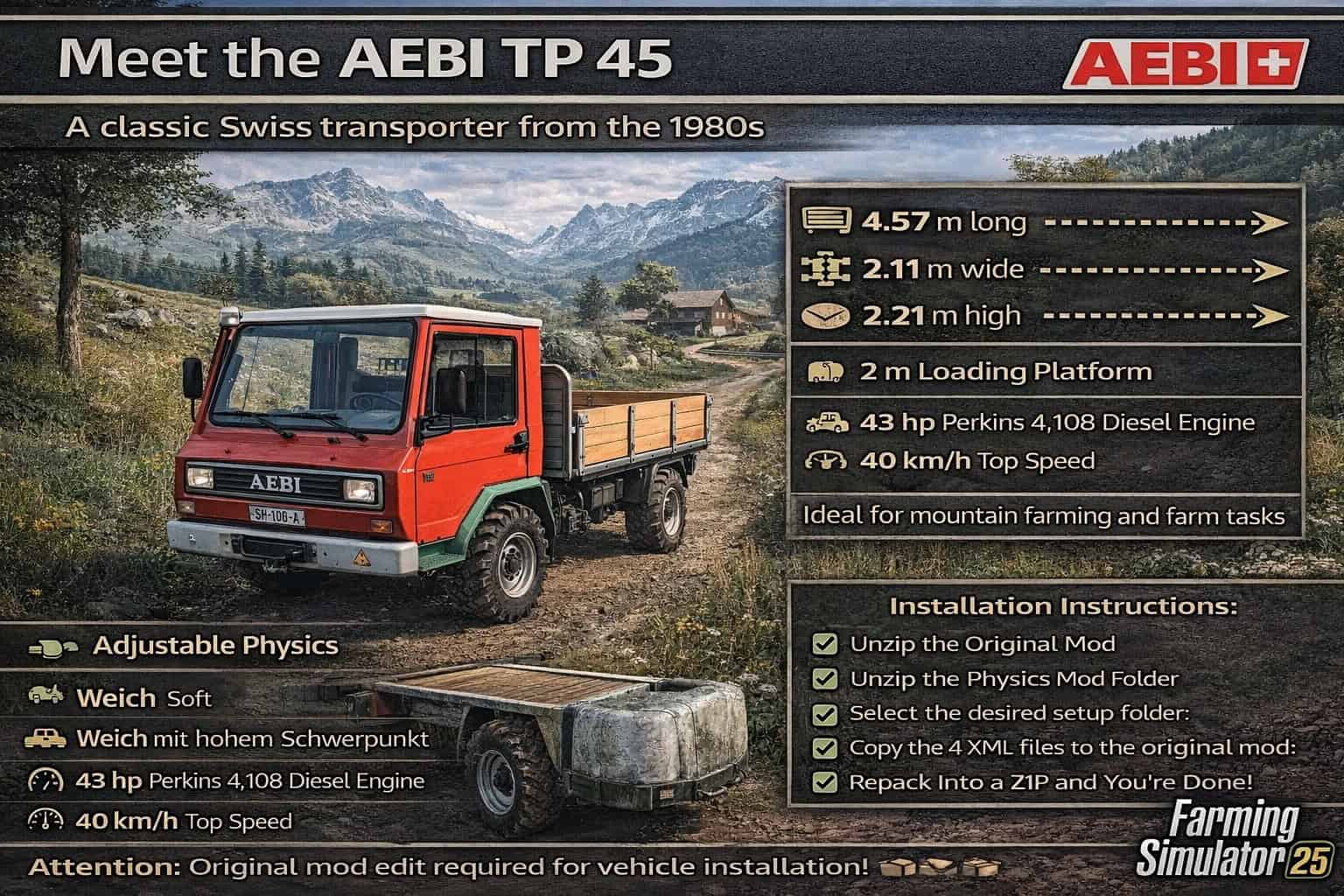 Get to know the AEBI TP 45, a classic Swiss transporter from the 1980s, in Farming Simulator 25. The model reflects real-life dimensions: 4.57 m long, 2.11 m wide and 2.21 m high, with a 2 m loading platform. The 2.4-ton transporter is powered by a 43 hp Perkins 4.108 diesel engine and reaches around 40 km/h. The mod includes a simple 3D model, the correct wheelbase and a configuration with engine and suspension parameters based on the original. Perfectly suited for mountain farming and farm missions in the game.