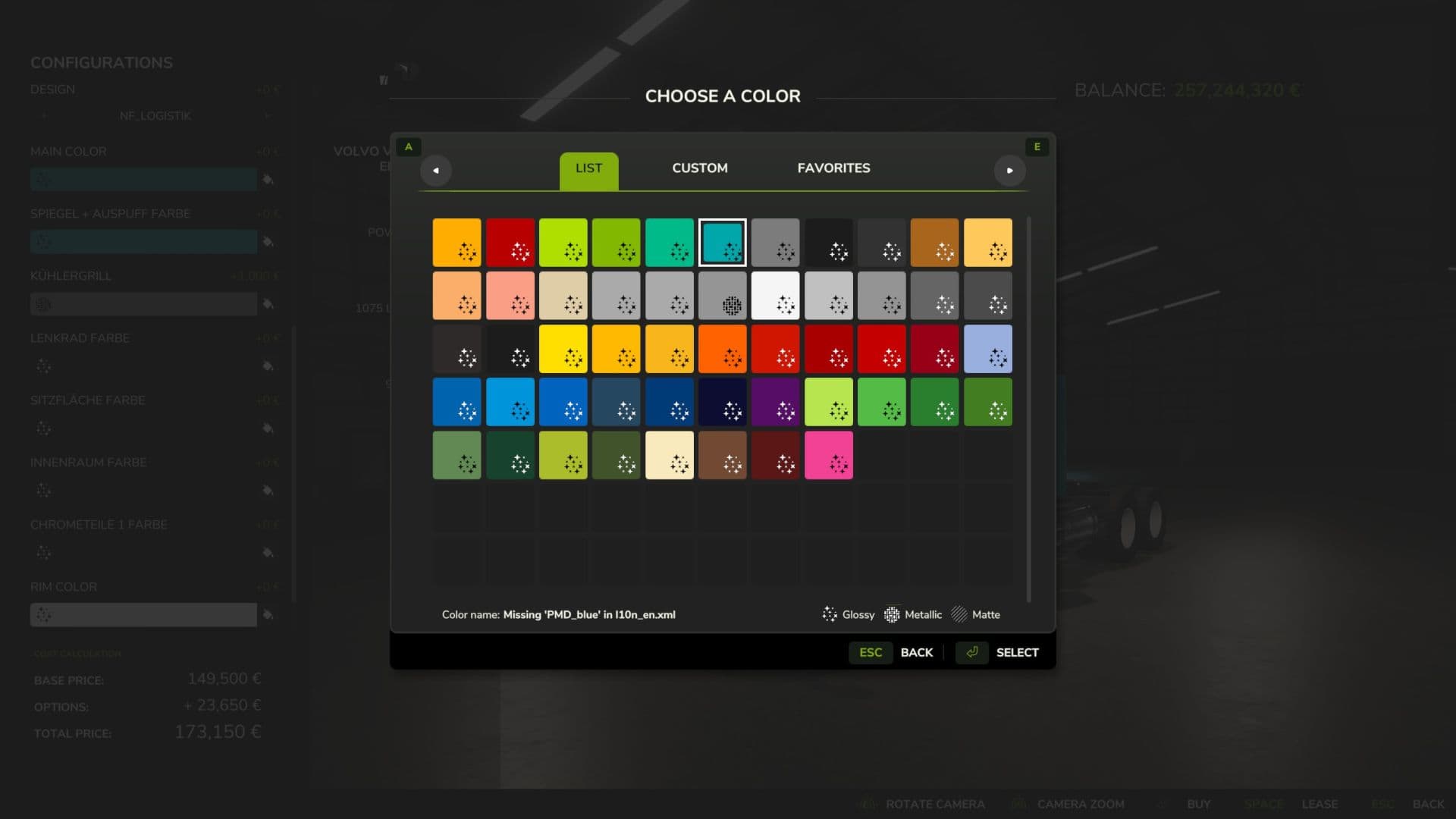 – Color selection for cabin, mirrors, exhaust, attachments, seats, interior, steering wheel, grille and rims