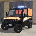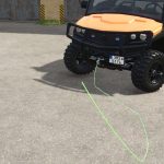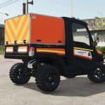 The ATV has the ability to store a chainsaw in the rear compartment, tow objects with a winch, and wash vehicles with a high-pressure pump.