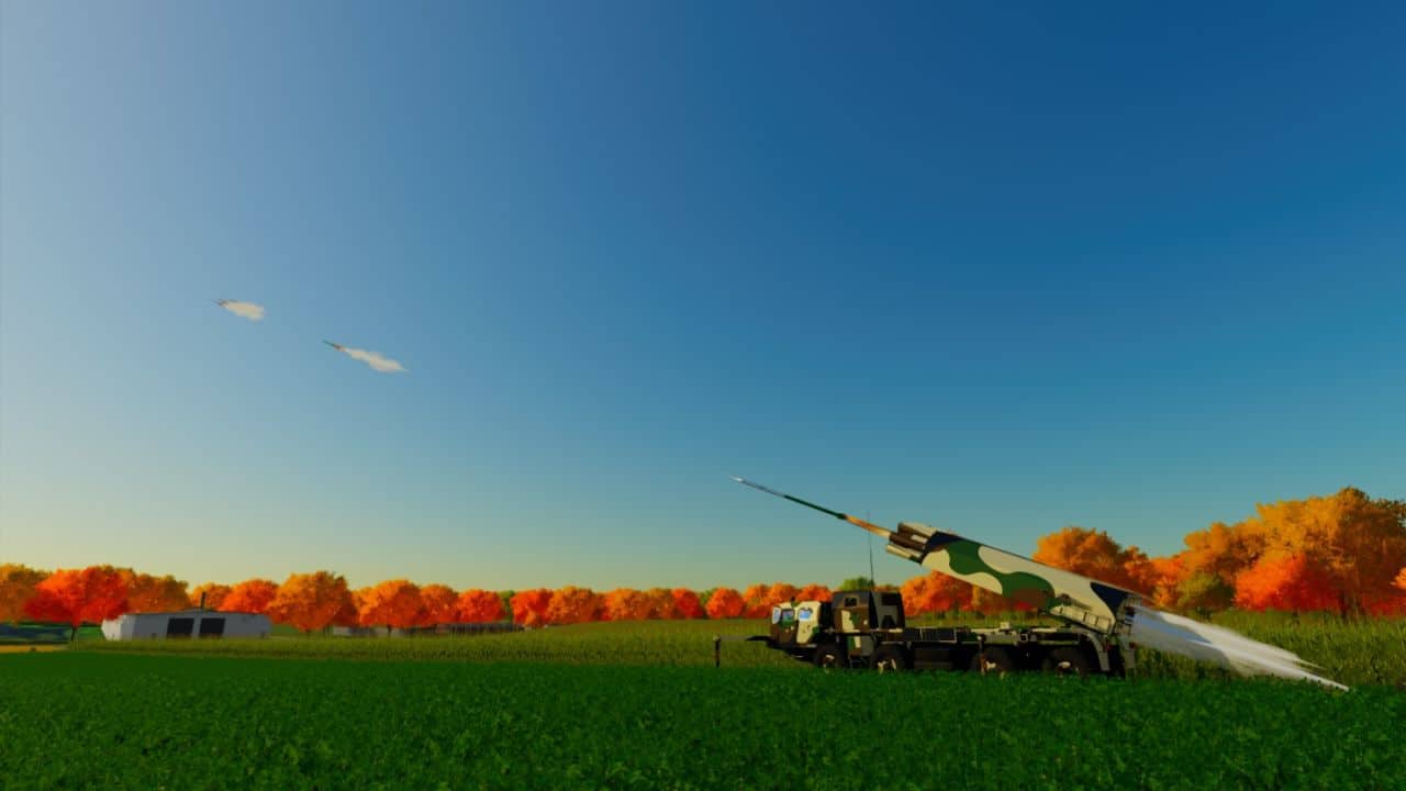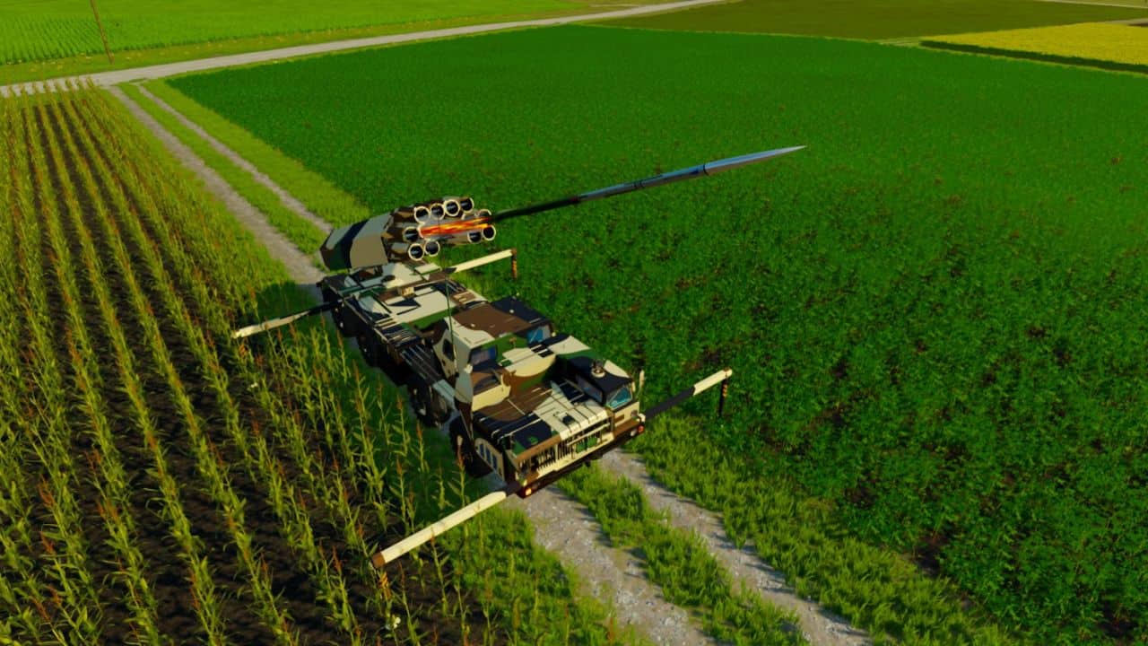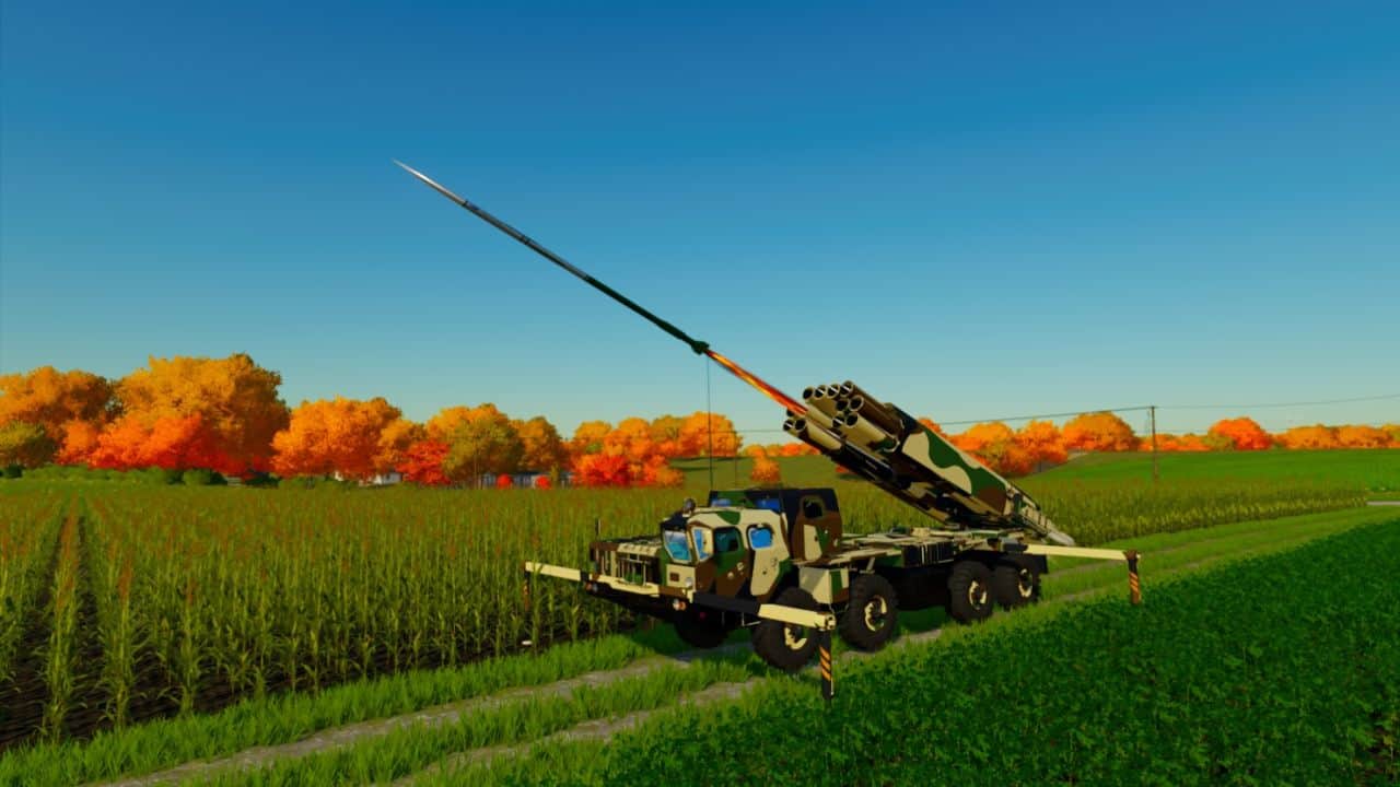 Multiple rocket launcher mounted on a truck. These rocket launching systems are used by military to display multiple rockets in a short period of time, providing a mass fire power over an extensive area. The truck has a camouflage paint scheme and is equipped with stabilizers to ensure its precision during launch.